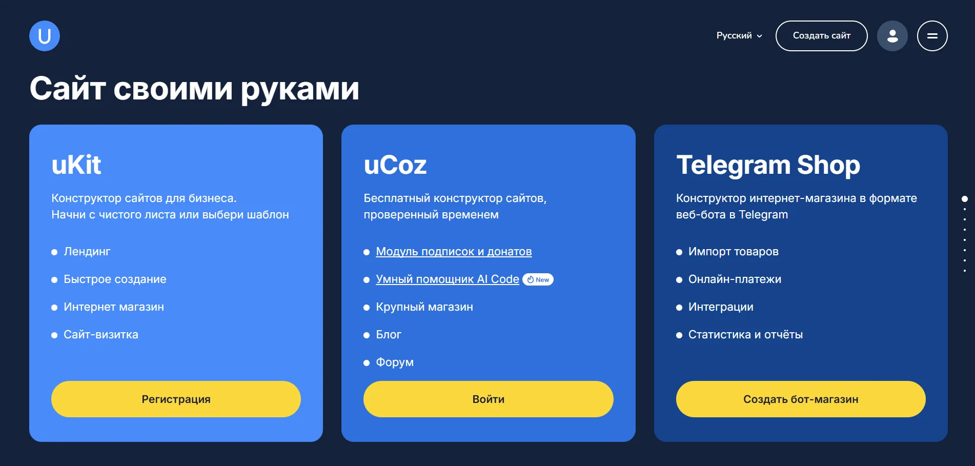 Ucoz — не просто конструктор сайтов. Он позволяет создавать лендинги, онлайн-магазины и другие ресурсы. А потом помогает разместить их на собственных серверах.
