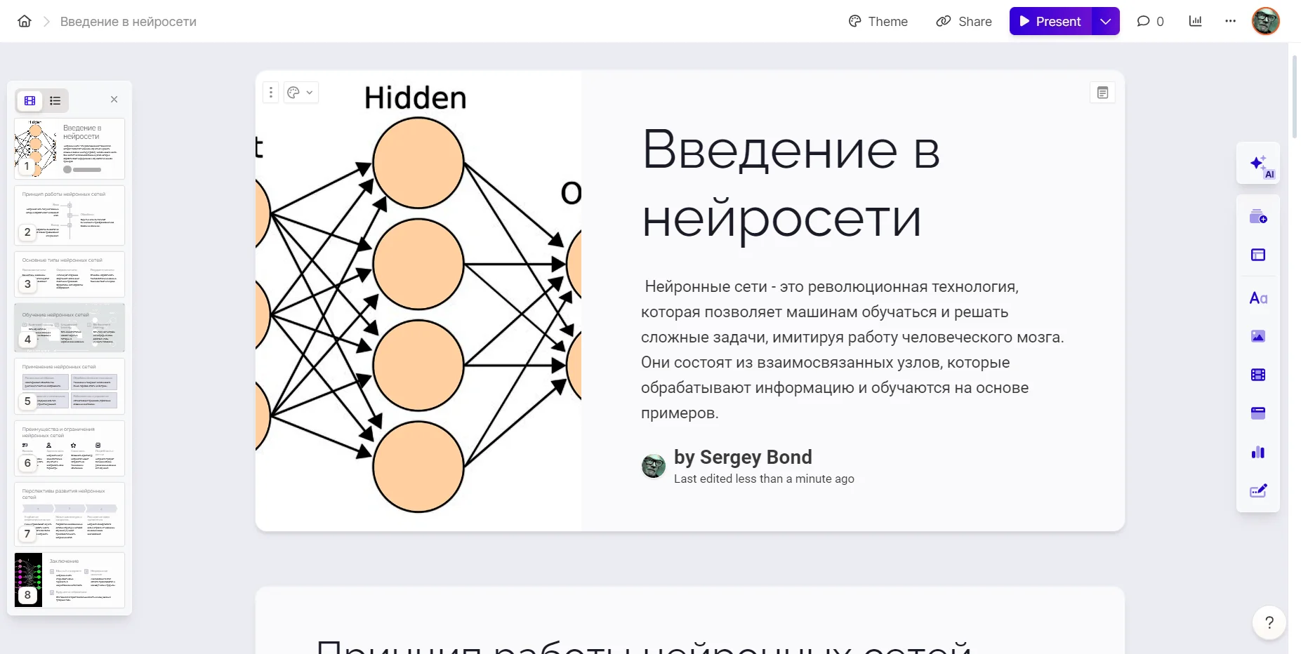 Сервис может анализировать текст и изображения, а затем автоматически генерировать слайды с контентом, который соответствует теме презентации.