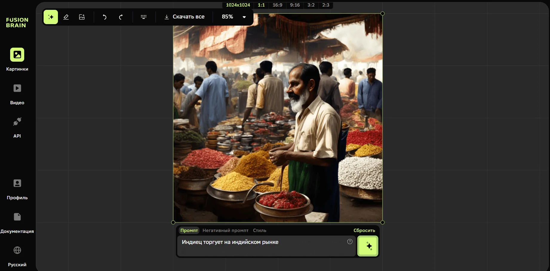 Чтобы создать картинку, пользователь выбирает область для генерации изображения, вводит текстовый запрос и выбирает один из 18 доступных стилей.