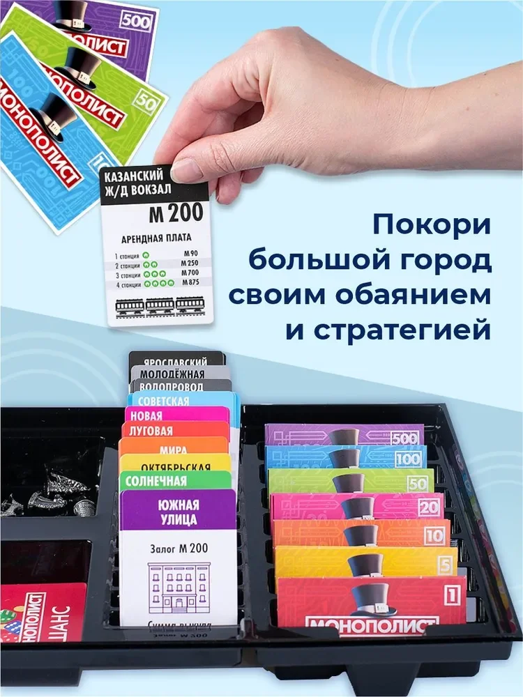 Сюжет игры. Вы — инвестор на игровом поле, а ваш инструмент — купюры и карты собственности. Выкупайте недвижимость у других игроков, вкладывайте деньги и увеличивайте шанс стать главным монополистом (но не коррупционером!)
