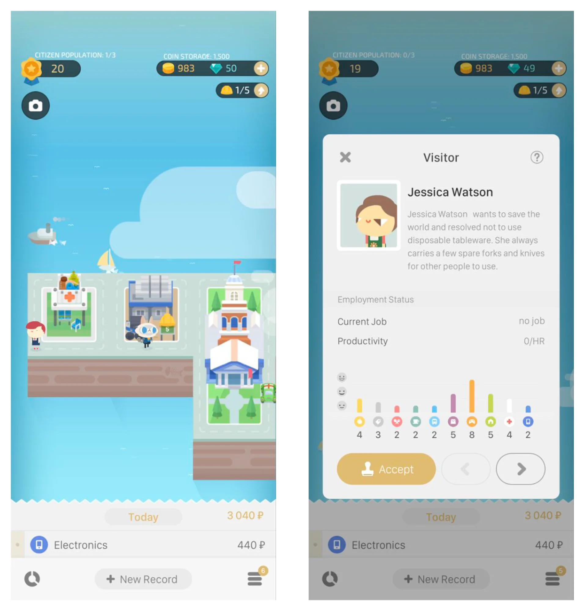 Сюжет игры. С этого дня вы управляете городом-островом и его жителями — открываете новые здания, устраиваете людей на работу. Чтобы сделать это, нужно зафиксировать свои расходы из реальной жизни и добавить на карту соответствующие здание.