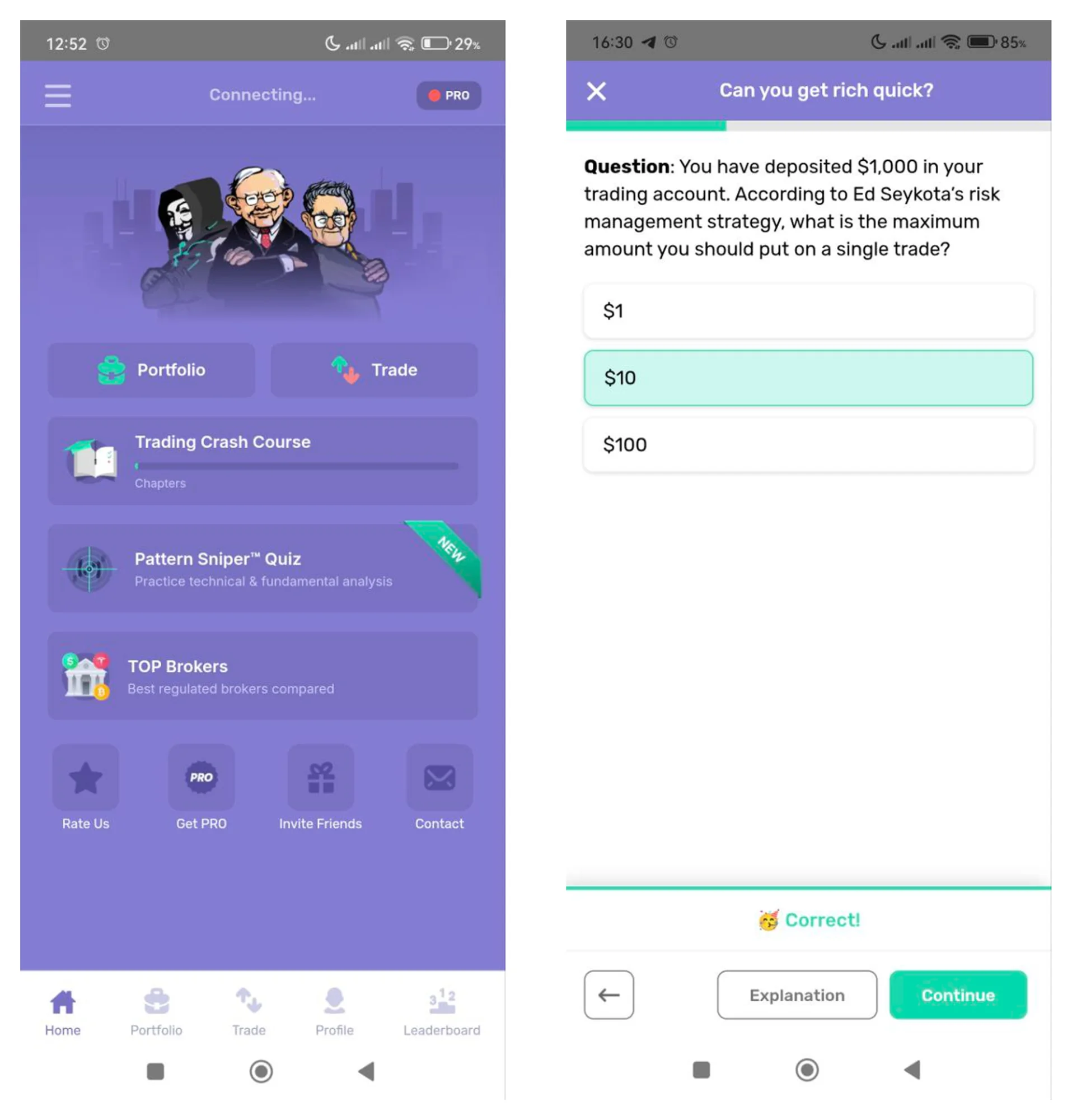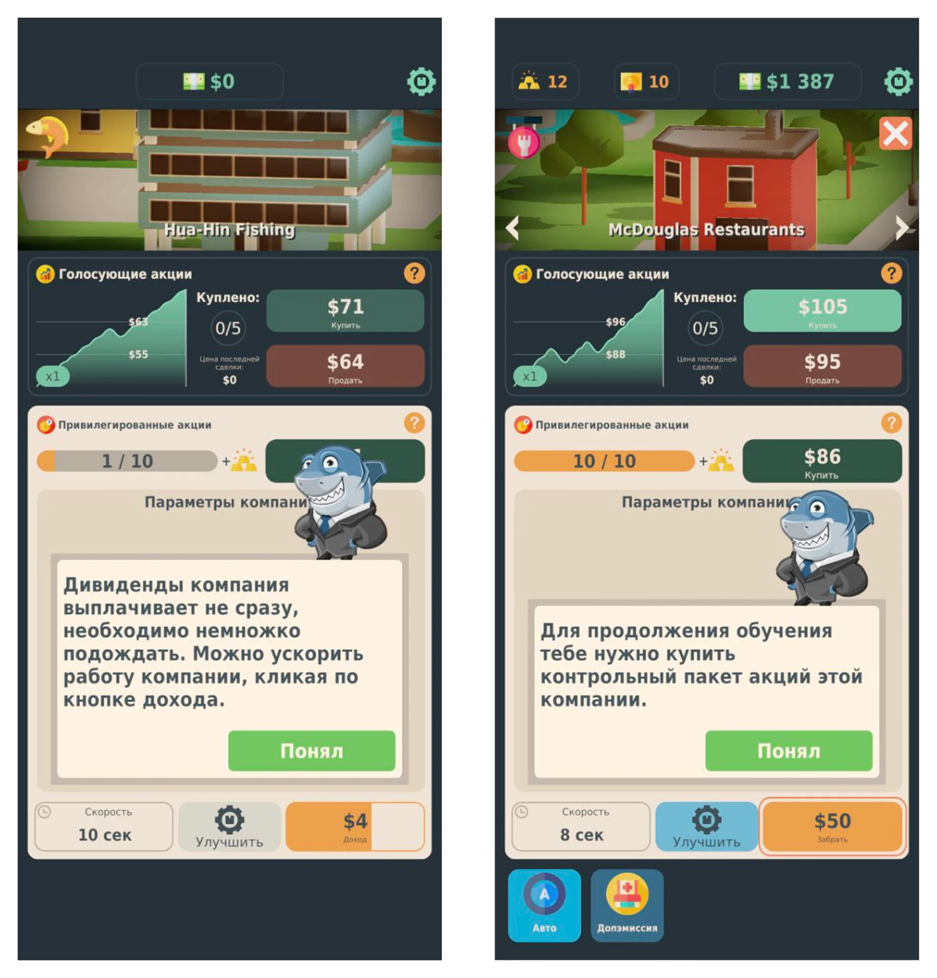 Фишки. Игра постепенно обучает инвестированию — объясняет понятие контрольного пакета акций, допэмиссии, автоматизации, холдингов. Нет отвлекающих процессов, надоедливой рекламы — только задания на освоение темы и компании, в которых можно закрепить результат.