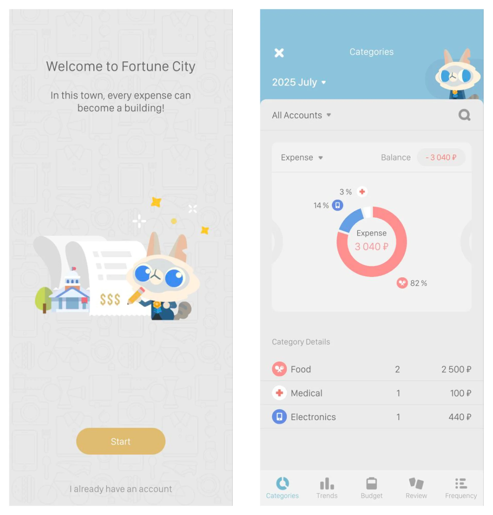 Фишки. Fortune City — это гибрид экономической стратегии и трекера расходов. Она учит правильно выбирать, во что вкладывать деньги. Например, если продуктовый разросся, а больницы в городе нет, скорее всего вы не следите за своим здоровьем. Поэтому на соседних с городом вкладах можно увидеть общую сумму трат за месяц и разбивку по категориям.