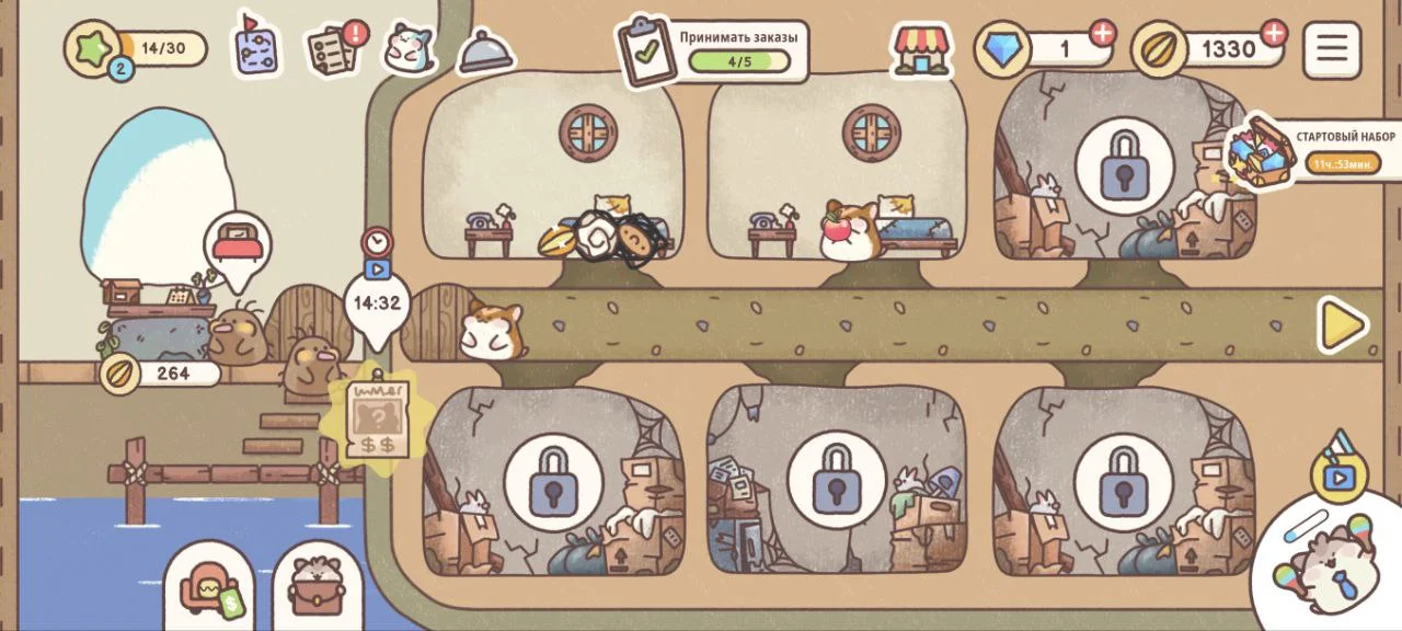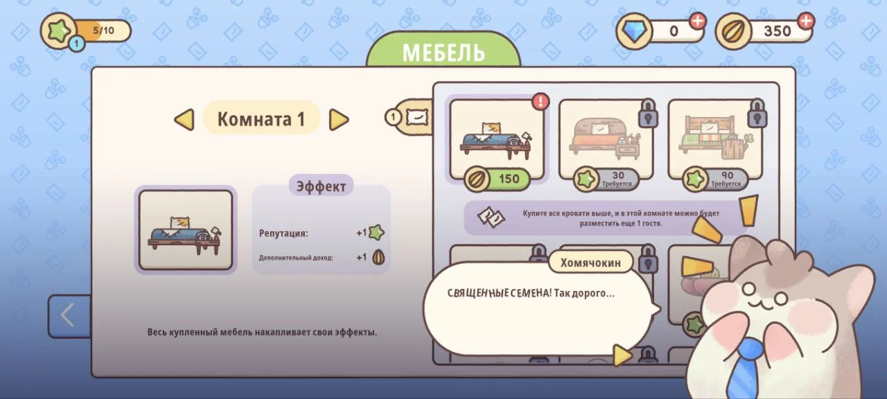 После первого гостя и бонусов от разработчика вы получаете 200 зернышек — их хватит только на одну простую кровать за 150. Дальше придется ждать, копить и по чуть-чуть расширяться.