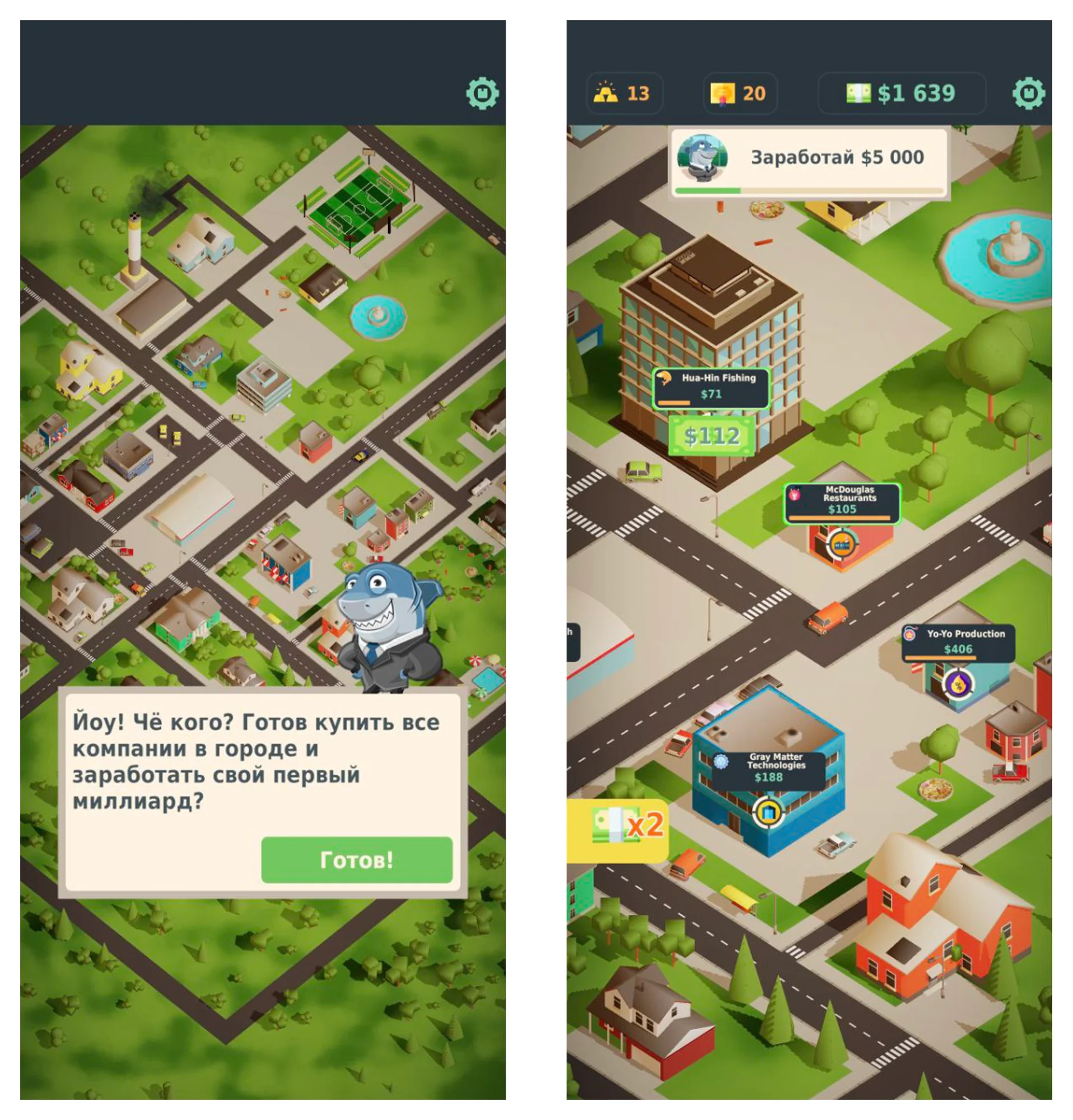 Сюжет игры. Завладеть всеми организациями в городе и построить стабильный источник дохода. Как только вы открываете игру, сразу видите первое здание — бизнес-центр. Вам предстоит покупать акции и вкладываться в маркетинг, строить новые этажи и всячески развивать центр, чтобы создавать пассивный источник дохода и в будущем покупать на него новые здания.