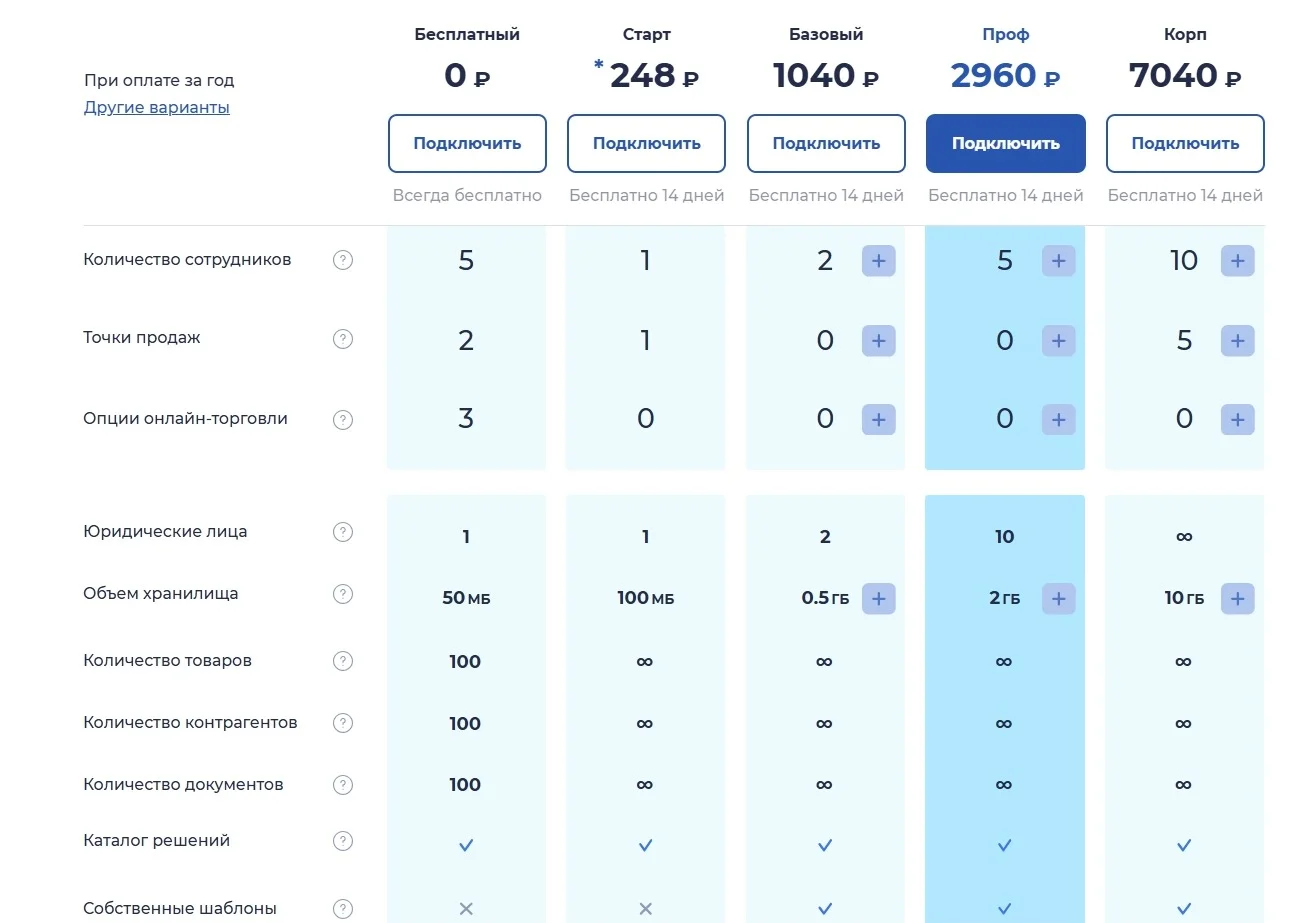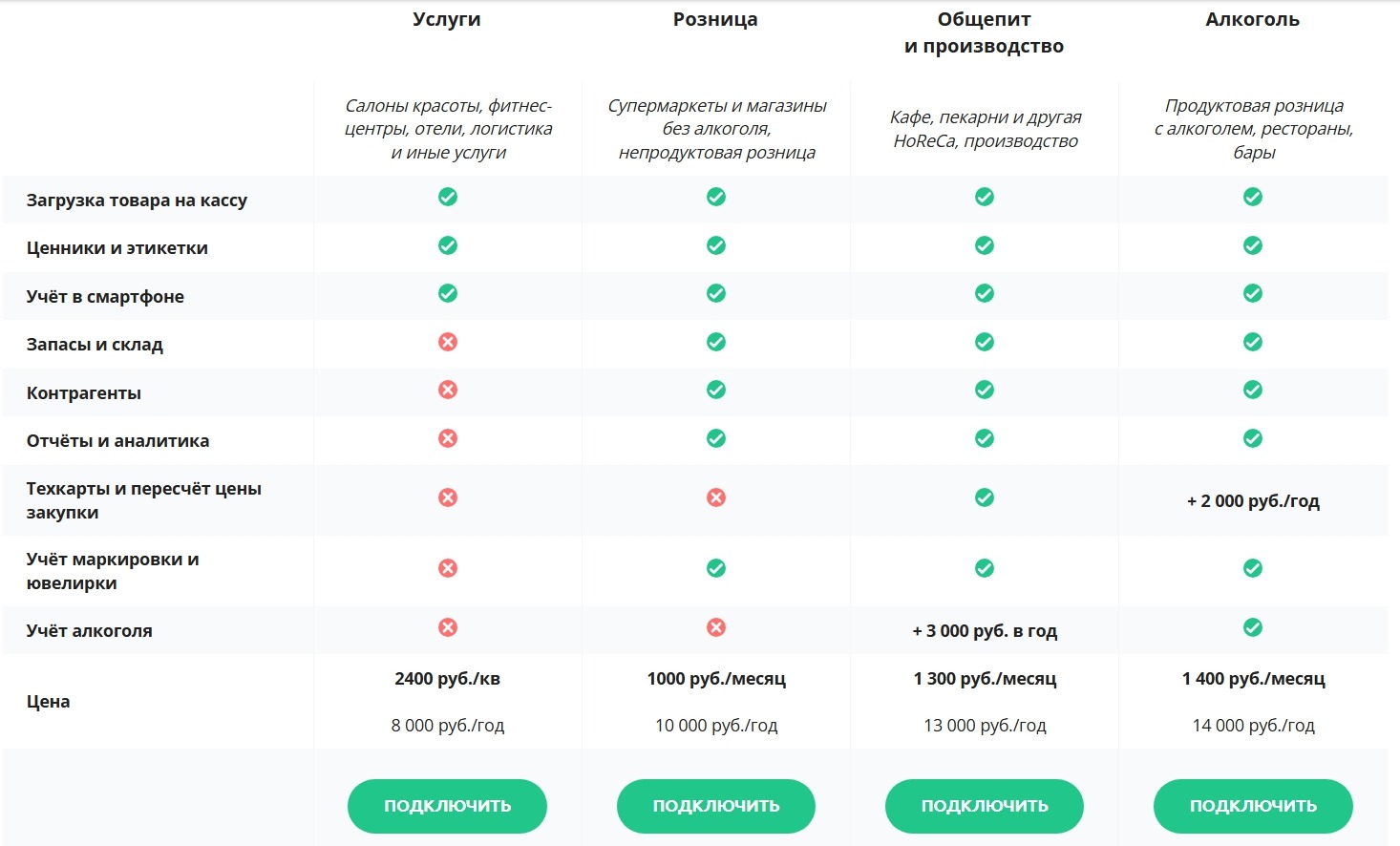 Цена. Есть бесплатный тариф для 1 пользователя, без возможности работать с маркированными товарами. Платные тарифы — от 375 ₽ до 4875 ₽.