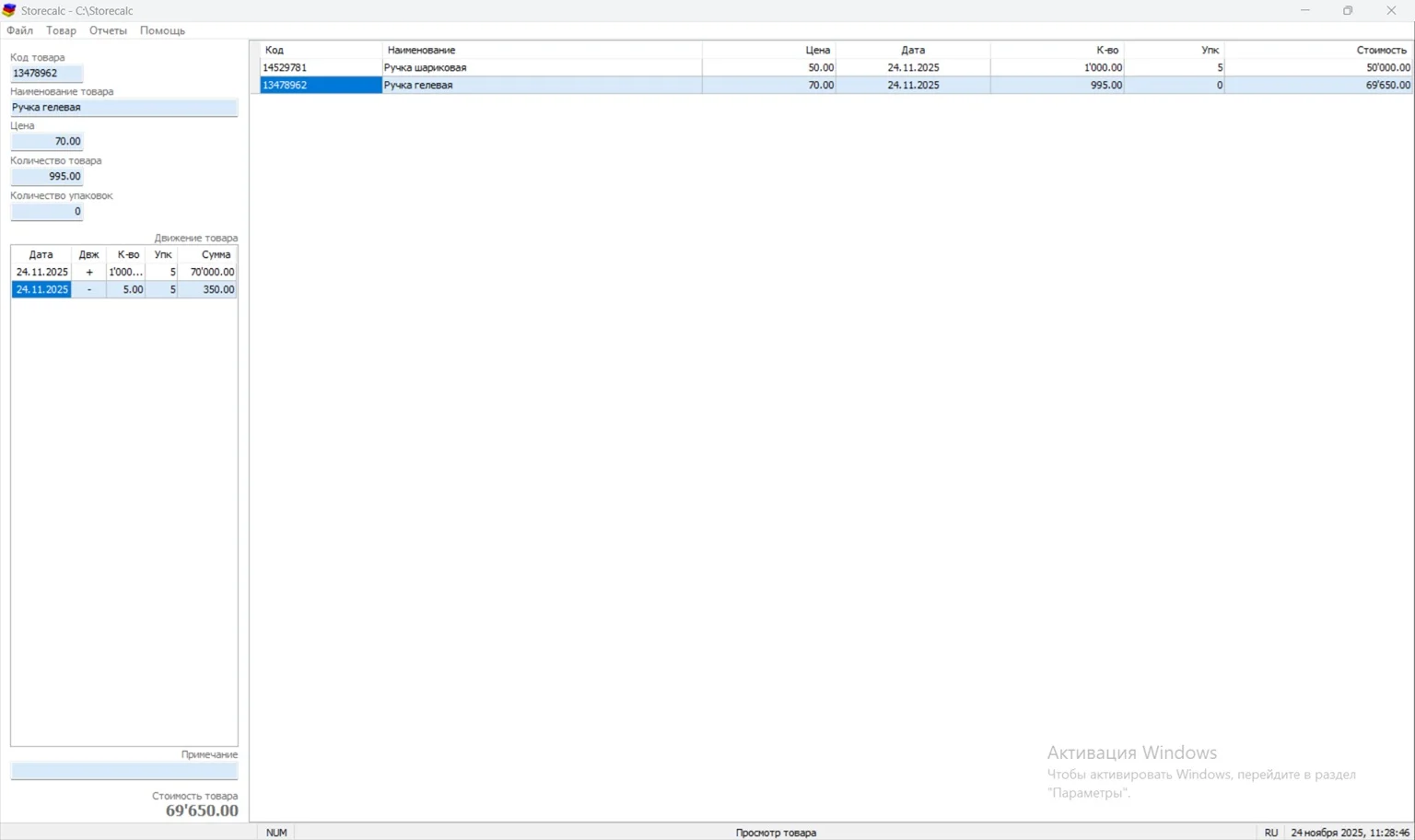 Простая программа складского учета, калькулятор для подсчета остатков. Пользователь вводит данные о поступлениях и продажах вручную, Storecalc считает, сколько осталось товаров.