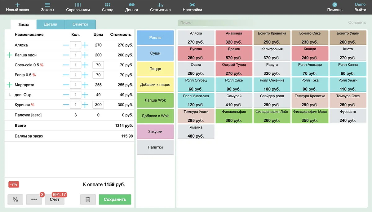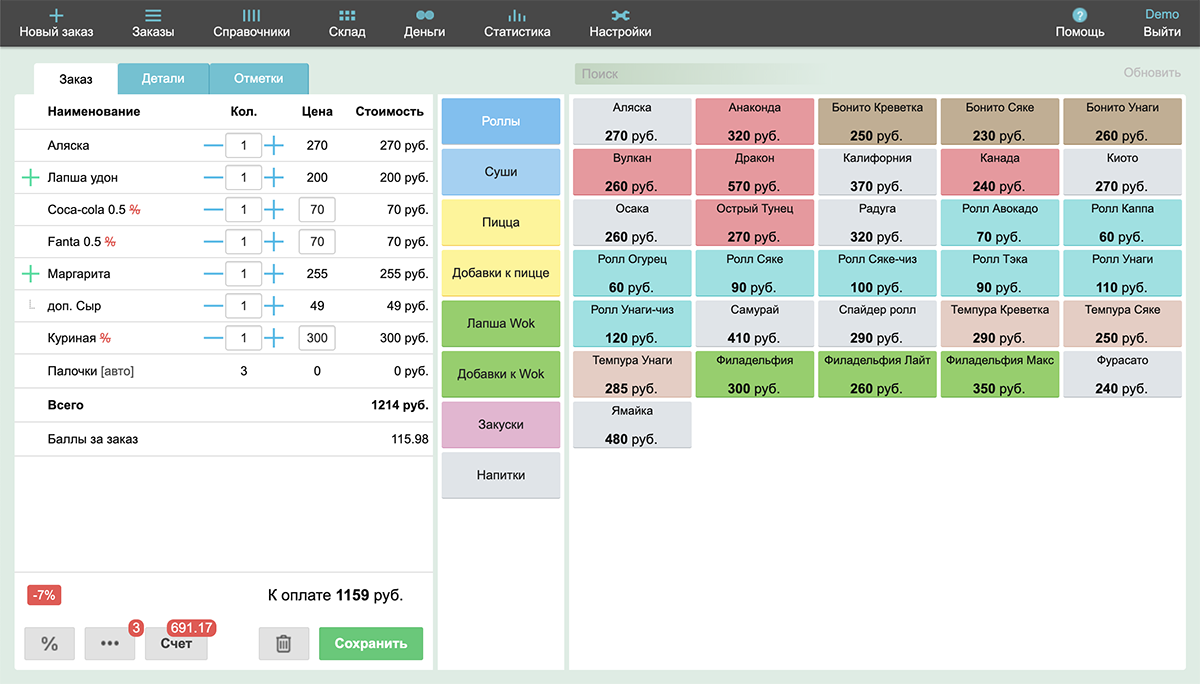 Сервис, который подходит для сферы общепита. Автоматизирует прием заказов, расчет стоимости, печать чеков, управление зонами обслуживания клиентов.