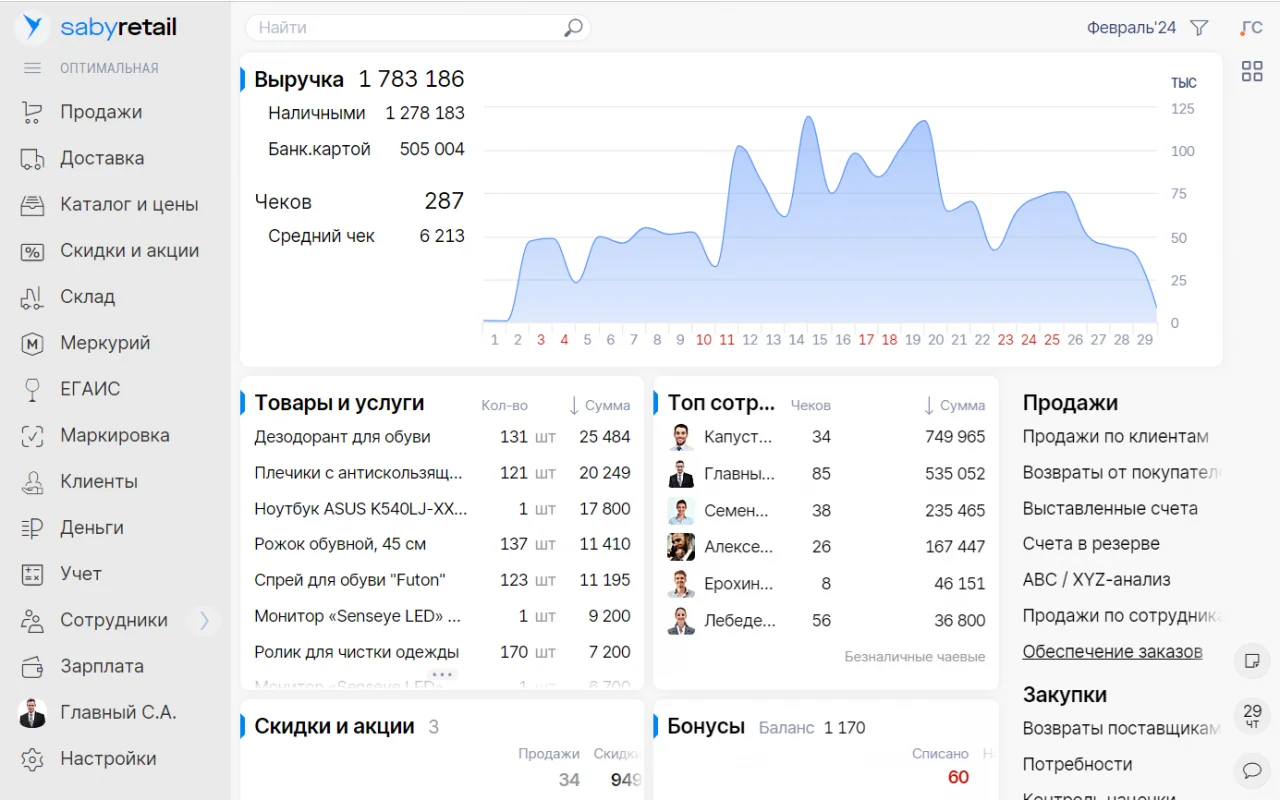 Saby Retail — новая версия продукта СБИС Розница, складская программа учета товаров с современным интерфейсом и множеством функций, способных закрыть потребности практически любой точки продаж с собственным складом. Программа считает почти всё: от товаров и скидок, до зарплат сотрудников.