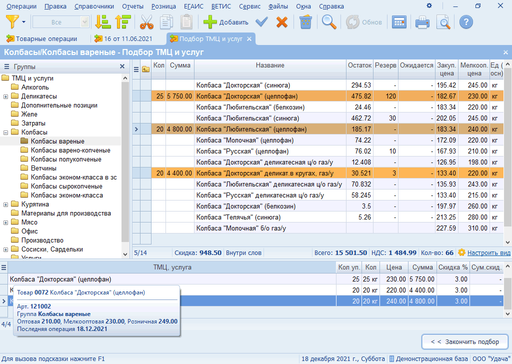 Разукомплектация работает в обратную сторону. Мясную тушку в программе проще разобрать на составные части. Тушка спишется с остатка, а ее части — встанут на приход.