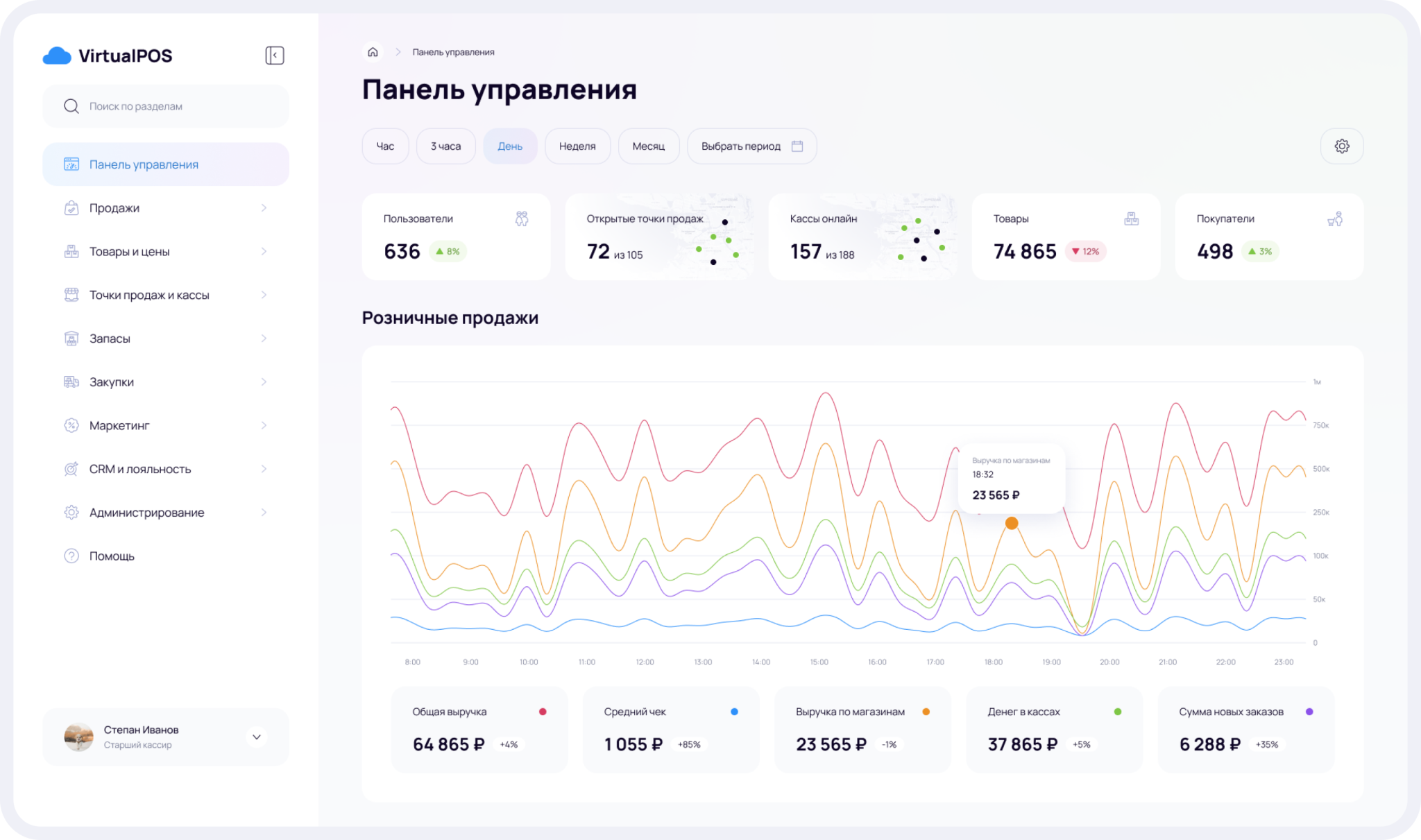Дашборд с основными финансовыми показателями: выручкой, данными о чекам, возвратах, скидках. Помогают оценить работу бизнеса.