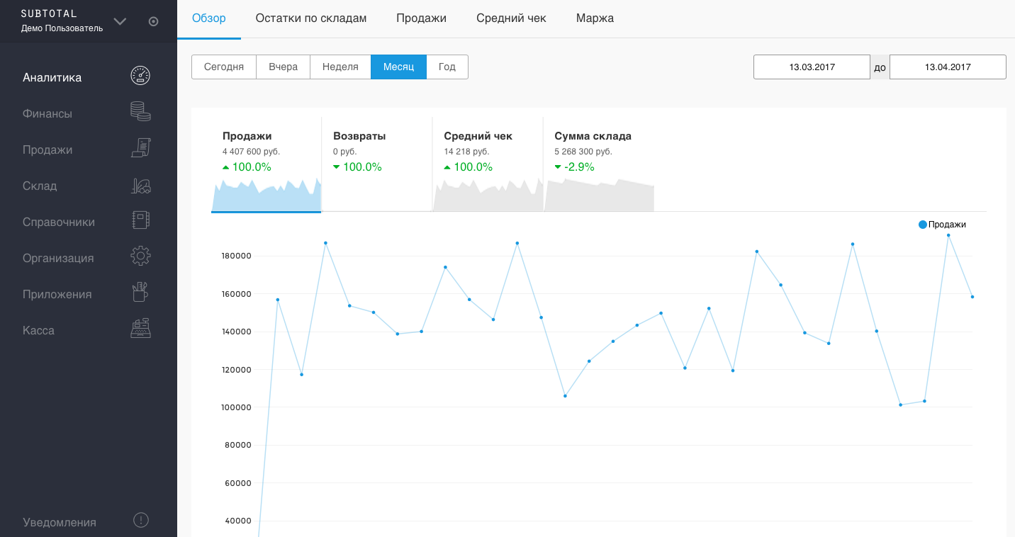 Система учета товаров и услуг, которая позволяет контролировать закупки, формировать отчеты и хранить данные по каждому клиенту. Помогает увеличить продажи за счет конструктора акций.