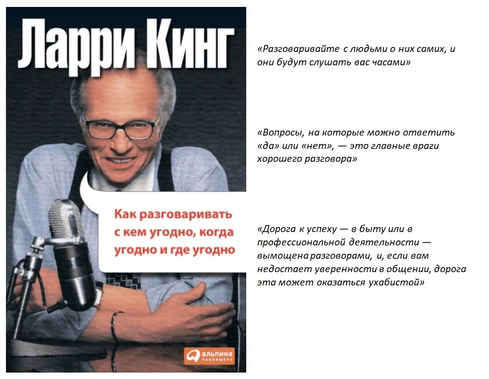 Автор книги — телеведущий Ларри Кинг — делится своим опытом и секретами успешных коммуникаций. Он рассказывает, как преодолевать страх перед публичными выступлениями, налаживать контакты с любым собеседником и продуктивно вести беседу. По мнению автора, самым главным в эффективном общении является искренний интерес к людям и готовность слушать. И именно это выступает основным посылом книги.