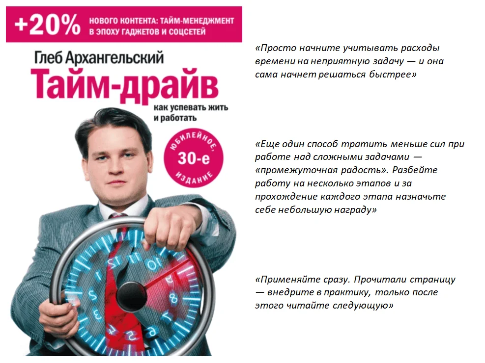 Книга подойдёт всем, кто работает с большими объёмами задач и хочет научиться оптимизировать процессы. Начинающих специалистов «Тайм-драйв» учит справляться с перегрузками на старте карьеры. Профессионалам книга поможет повысить продуктивность, а руководителям — лучше организовать свою команду.