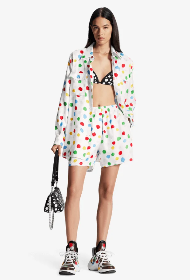 Живопись, скульптуры, инсталляции и перформансы Кусамы объединяет общий паттерн — фирменный разноцветный горошек. В рамках коллаборации её фирменным горошком украсили сумки, одежду, аксессуары, а также парфюм и даже доску для серфинга.