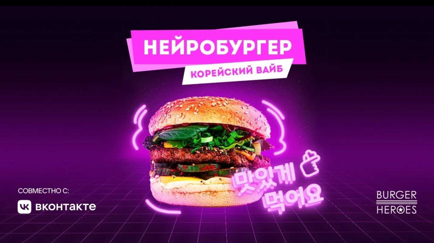 Идея коллаборации. Сотрудники ВКонтакте создали нейросеть, которая проанализировала тренды и определила, какие ингредиенты могли бы завоевать популярность у молодой аудитории. Самым заметным трендом оказалась корейская поп-культура. Технологи сети Burger Heroes выбрали продукты и адаптировали в формат бургера, который должен понравится как любителям азиатской кухни, так и европейской.
