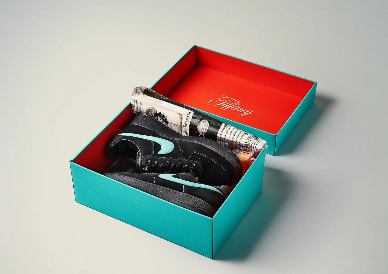 Идея коллаборации. Ювелирный дом Tiffany&Co и бренд спортивной одежды и аксессуаров Nike выпустили совместную пару кроссовок. Выбор пал на модель Nike Air Force 1. Кроссовки сделаны из высококачественной черной замши, фирменная галочка Nike выполнена в цвете Tiffany Blue, а на язычке есть логотип Tiffany. Также над пяткой есть серебряные пластины 925 пробы с лазерной гравировкой. Кроссовки выпустили к 150-ой годовщине основания Tiffany.