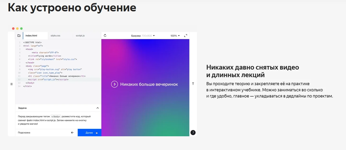 Кому подойдёт: новичкам, которые хотят попробовать веб-разработку. Тем, кто уже знает основы HTML и CSS и хочет прокачать навыки.