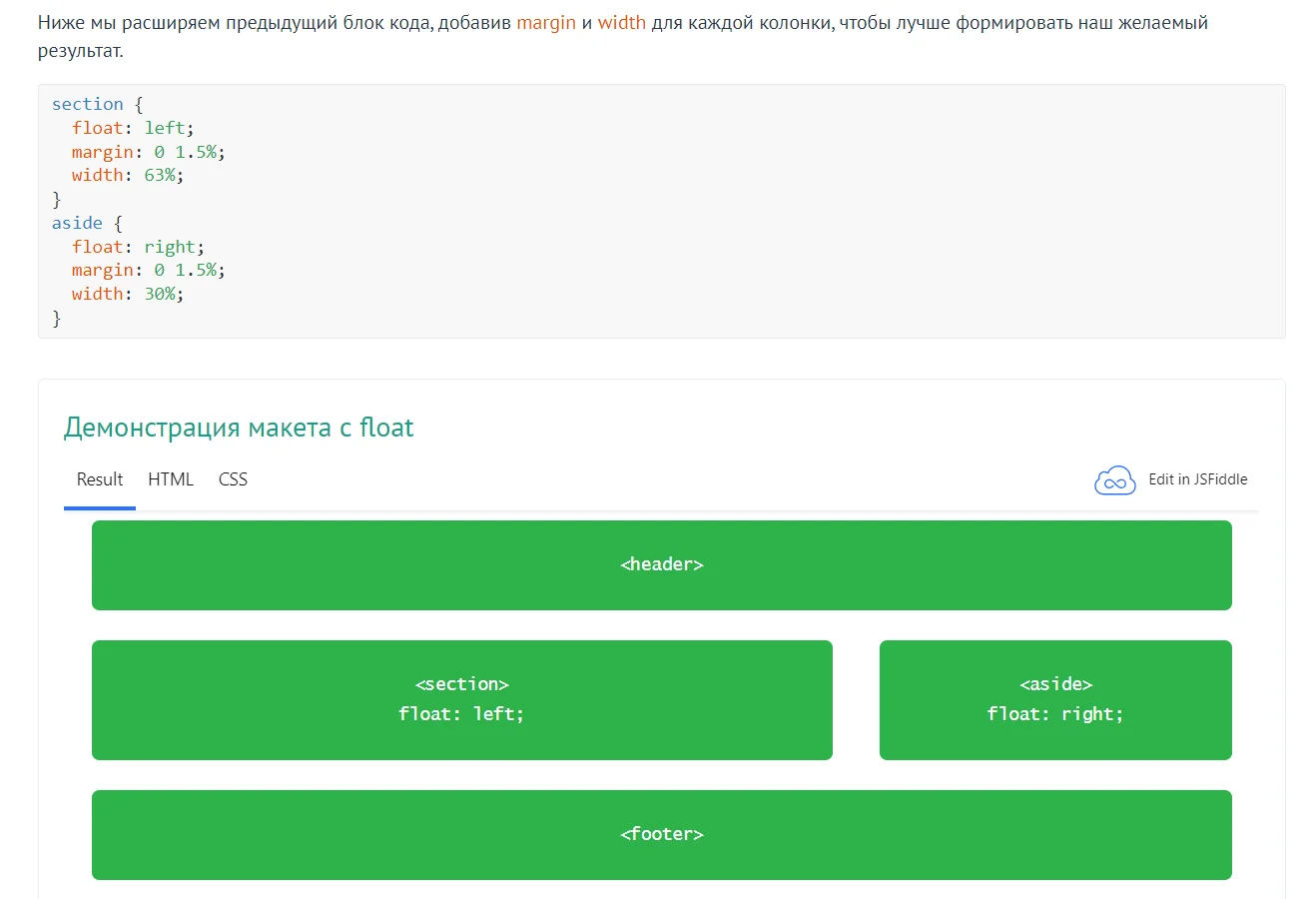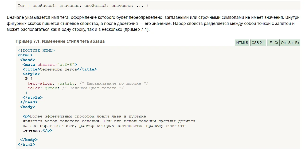 Каждая глава разделена на блоки и содержит примеры с демонстрациями на макетах. В них можно смотреть, как код выглядит в результате, как он описан в HTML и CSS.