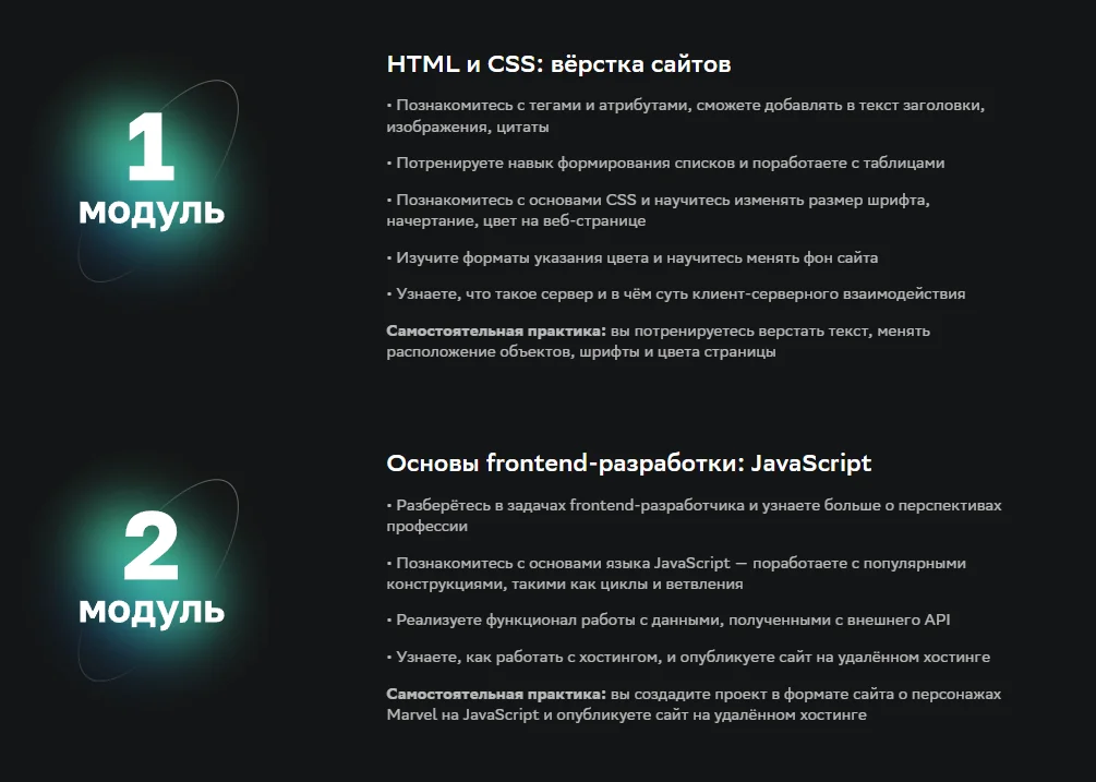 Здесь рассказывают об основах и возможностях HTML и CSS, учат работать с макетами и адаптивной вёрсткой, а также вводят в JavaScript и React.
