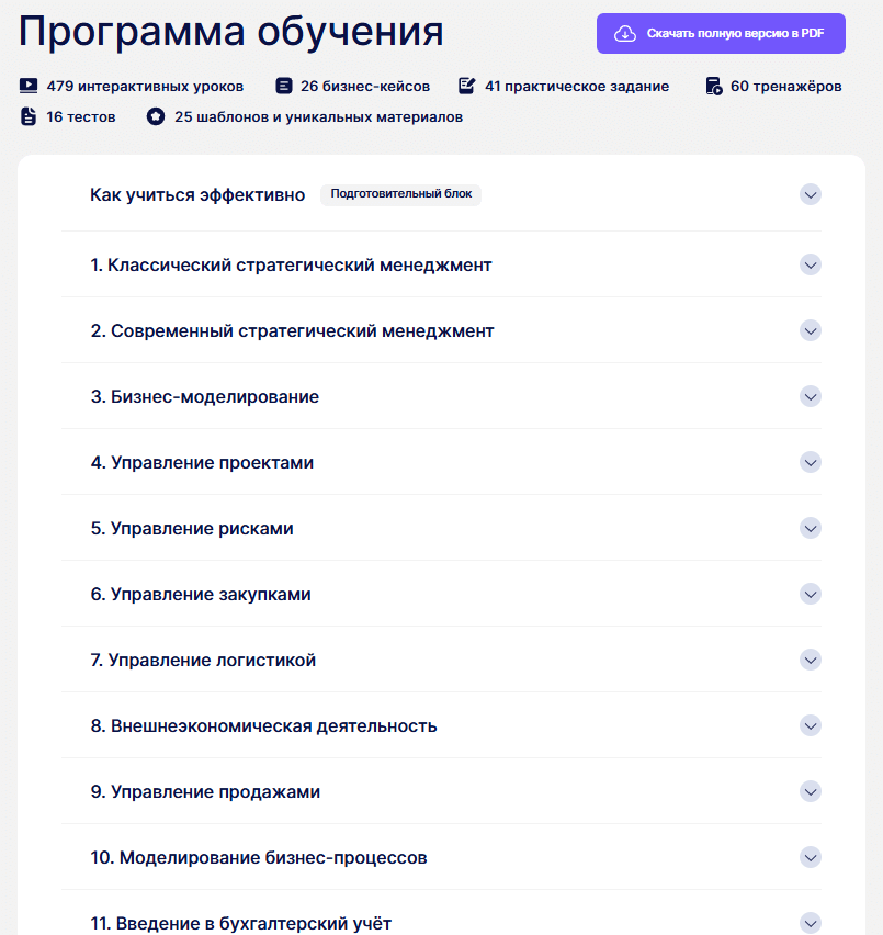 Чему научат: оценивать рынок, создавать стратегию бизнеса, выстраивать продажи, определять маркетинговую стратегию, находить деньги для ведения бизнеса, разбираться в законодательстве.