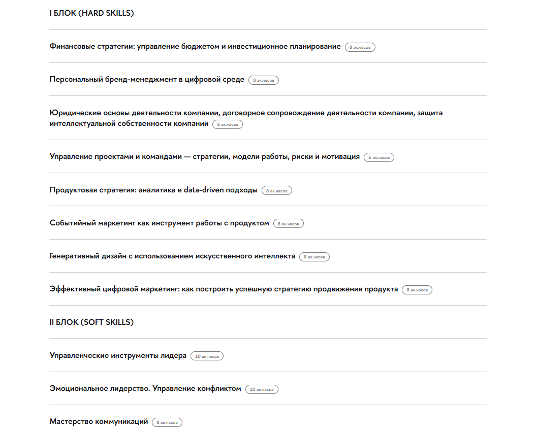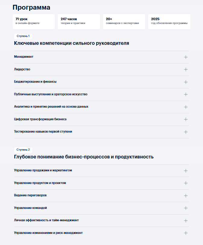 Чему научат: выстраивать коммуникации, отслеживать тренды, ставить цели, управлять финансами, собирать команду, планировать развитие карьеры.