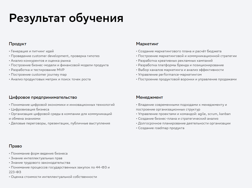Чему научат: выбирать бизнес-идею, оценивать рынок, создавать MVP, управлять бизнес-процессами, формировать команду, разбираться в финансовых и правовых вопросах, отслеживать аналитику, создавать стратегии продвижения.