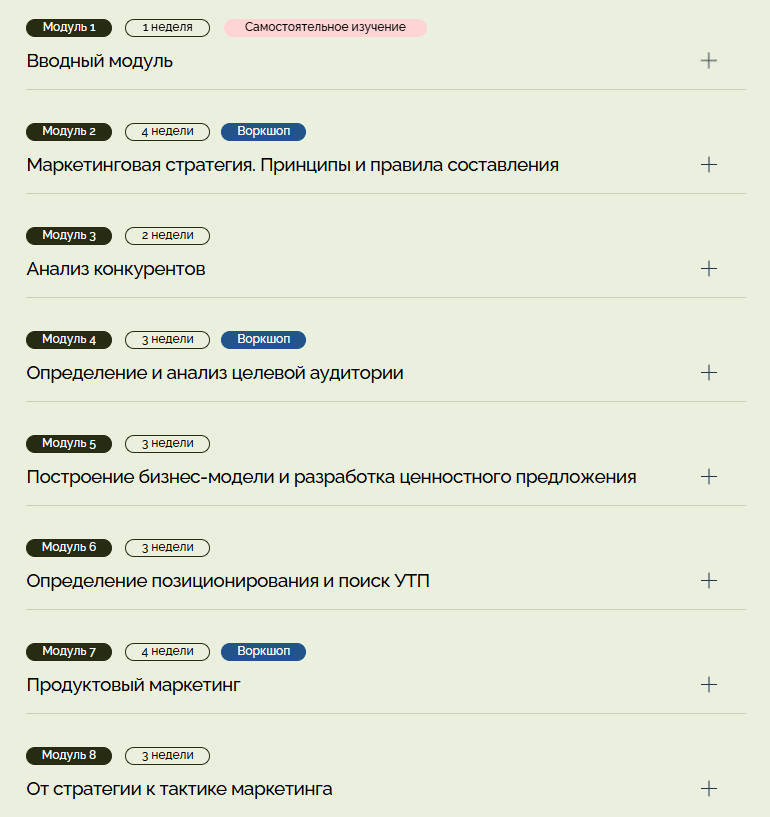 Сразу после оплаты открывается доступ ко всем материалам, которые можно изучать в своём режиме. Учебный материал упакован в удобные форматы: видео, лонгриды, кейс-тесты, подкасты. Прохождение одного модуля занимает около четырёх недель. По завершении модуля студент отвечает на тестовые вопросы. В конце обучения необходимо выполнить итоговое задание по всем изученным темам. Тариф «Бизнес» подразумевает обучение для компании (юрлиц). Можно обучать группу людей до 15 человек.