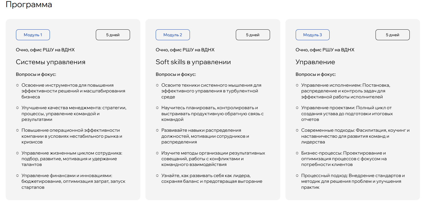 Программа состоит из трёх модулей по пять дней каждый. В течение 15 дней, с перерывами между модулями, студенты изучают материалы на очных или онлайн-лекциях. Теорию сопровождают практикумы для отработки полученных навыков. Также программа предусматривает выполнение тематических упражнений и разбор кейсов. По итогам обучения каждый участник получает полезные навыки, практики и инструменты для управления бизнесом.