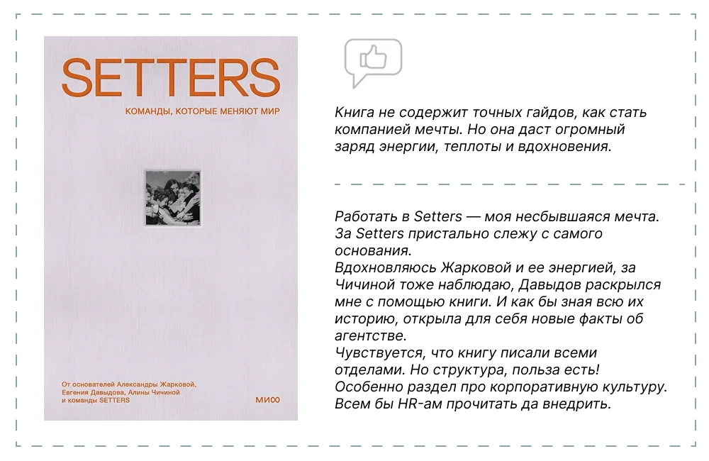 Мнения о «Командах, которые меняют мир» — неоднозначные. Одни находят в ней источник вдохновения, другие говорят, что о самой корпоративной культуре написано мало и поверхностно. Но за SETTERS говорит не книга, а их проекты. Недаром агентство входит в топ-5 национального рейтинга креативности АКАР, ежегодно занимает призовые места на международных премиях.