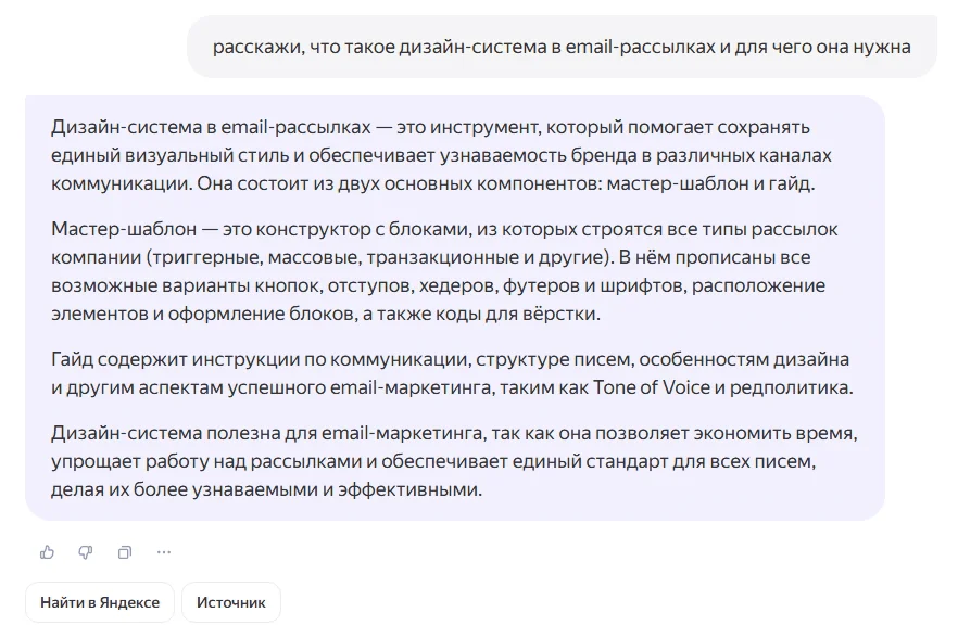 Попробуем задать нейросети вопрос на тему, о которой совсем недавно писали в блоге — про дизайн-систему рассылок.