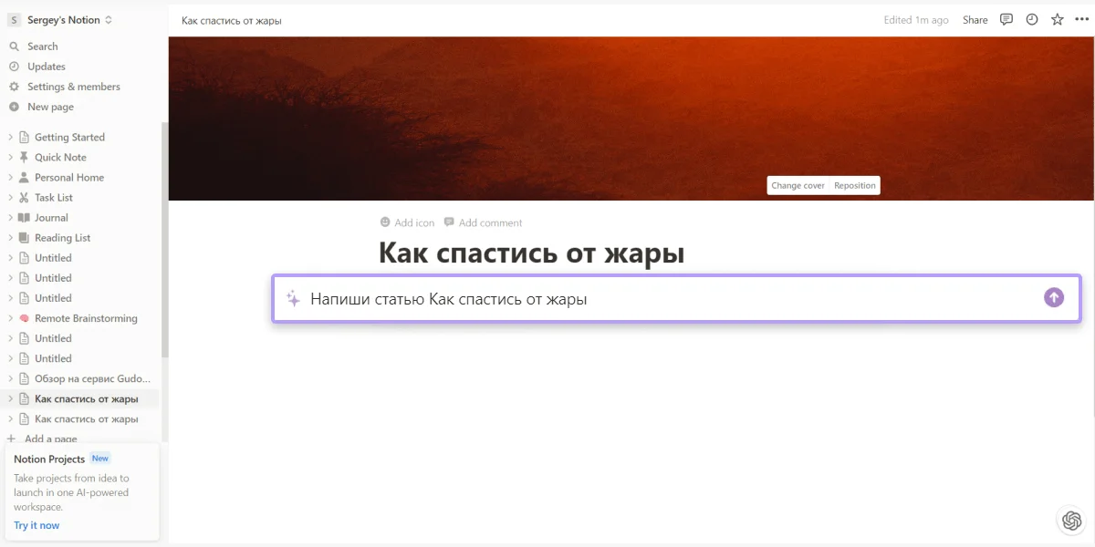 Чтобы начать работать с платформой, зарегистрируйтесь любым удобным способом и создайте новый документ. В Notion много шаблонов — выберите подходящий и укажите тему текста. Например: «Как спастись от жары». Далее командой Ctrl+J вызовите помощника и в выделенной строке напишите команду для нейросети.