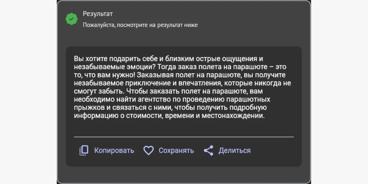 С созданием короткого абзаца сервис справился неплохо. Его можно скопировать, поделиться или сохранить в черновиках.