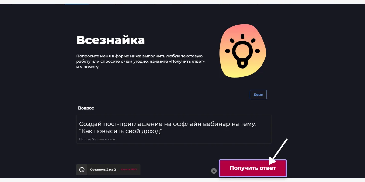 Выберите функцию или шаблон для создания контента, заполните поля и нажмите «Получить ответ».
