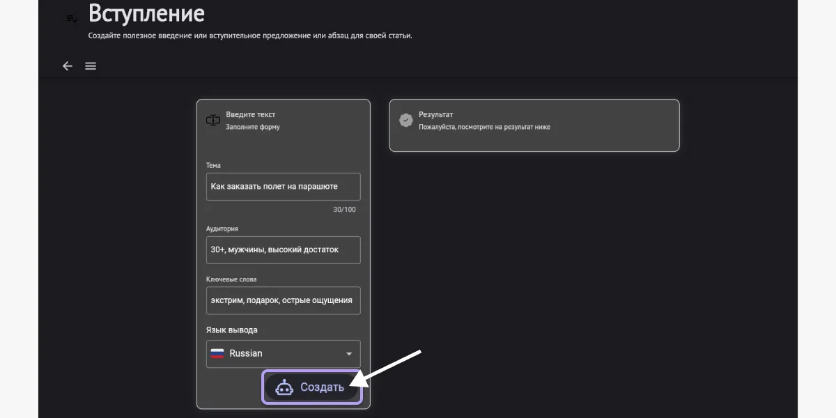 Выбираем шаблон. Например, «Вступление» — он помогает написать вводную часть или лид-абзац к статье. Заполняем поля «Тема» и «Аудитория» (здесь нужно перечислить, на кого расчитан будет текст — например, возраст, интересы, уровень дохода). Затем через запятую вписываем ключевые слова. Устанавливаем русский язык, иначе ответ будет на английском. И жмём на «Создать».