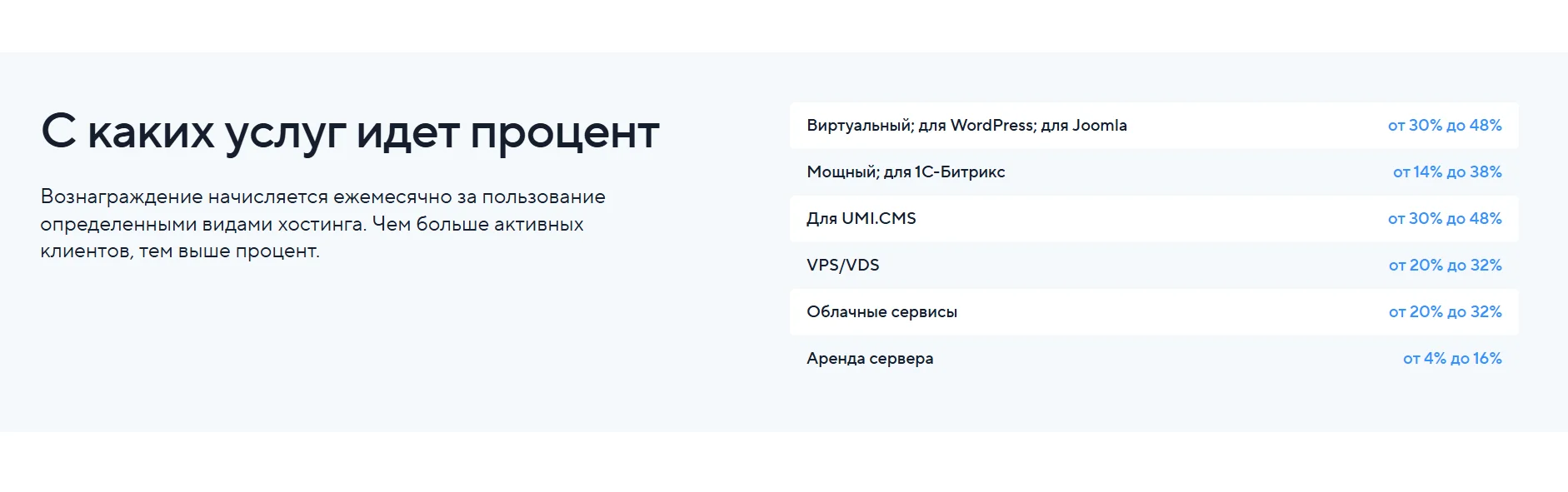 Сколько платят. Оплата зависит от типа продукта. Если аренда сервера ― от 4% до 16%. А если хостинги для WordPress и других CMS ― от 30% до 48%.
