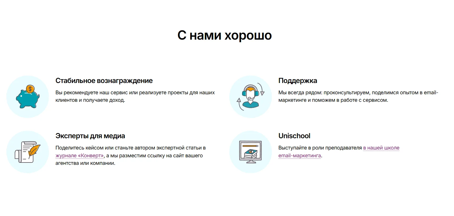 Кому подойдет программа. Маркетинговым агентствам, вебмастерам и фрилансерам, которые советуют сервис своим клиентам или хотят найти больше заказчиков. Блогерам и порталам, посвященным бизнесу — можно рассказывать о пользе email-маркетинга и советовать Unisender.