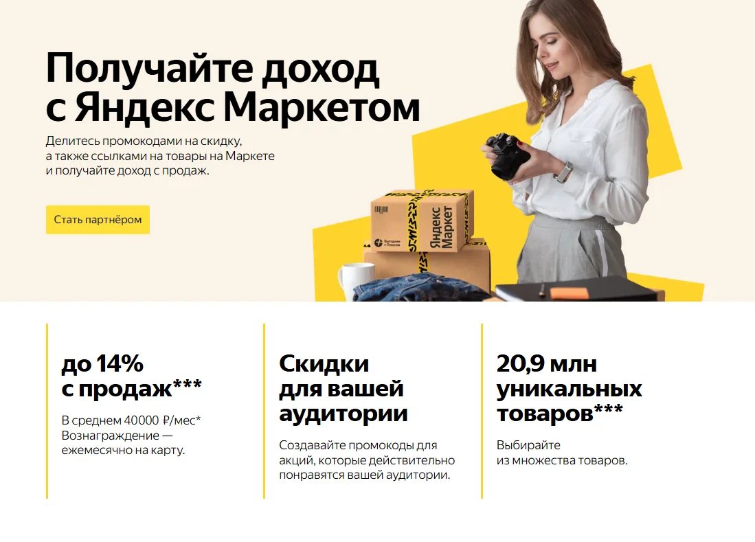 Сколько платят. Сумма заработка на партнерской программе Яндекс Маркета зависит от источника трафика, его количества и качества — за оплаченные заказы можно заработать от 1 до 14%. В месяц средний заработок 40 000 ₽.