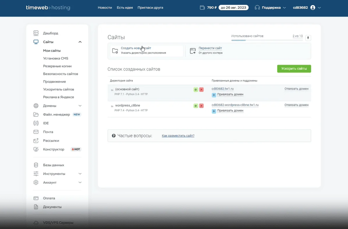 Поддержка Timeweb может перенести на хостинг любой сайт и проверит его работоспособность. Ресурсы с доменами .RU или .РФ переносятся бесплатно. При необходимости сервис заключает индивидуальный договор и предоставляет все необходимые документы о сотрудничестве и затратах для ведения отчетности.