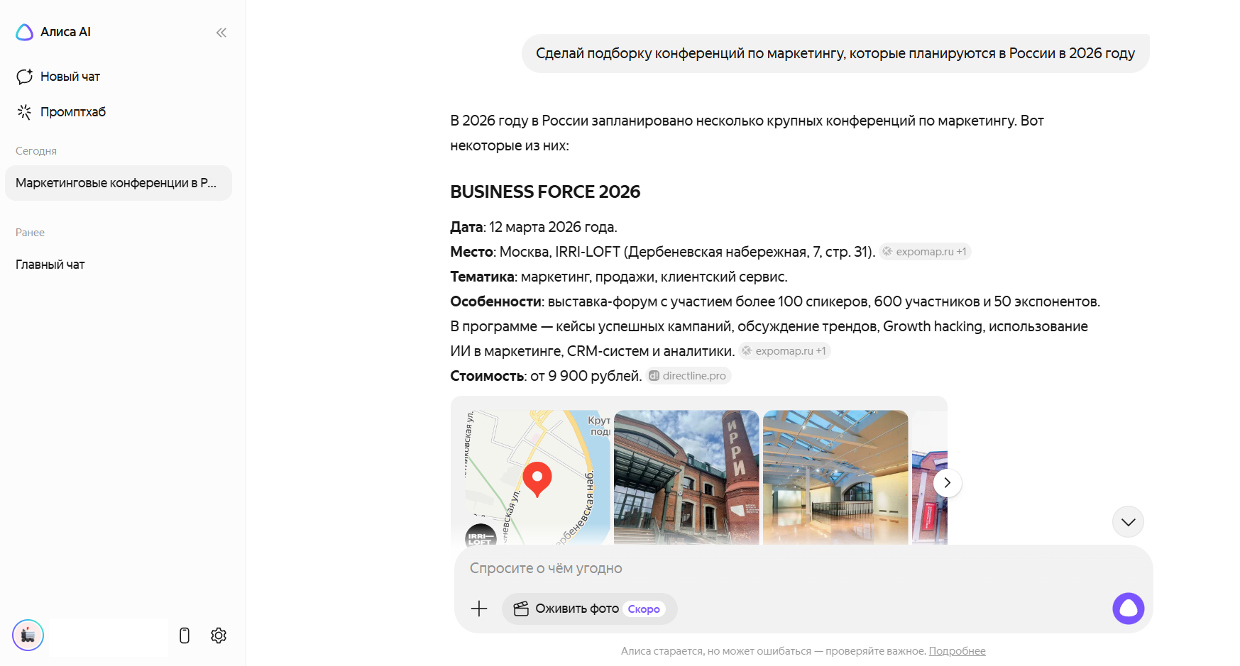 Алиса AI — виртуальный AI‑ассистент от Яндекса. Подходит для поиска, анализа и генерации информации. Работает на русском и английском языке, но с большей оптимизацией для русского. Основные возможности Алисы: