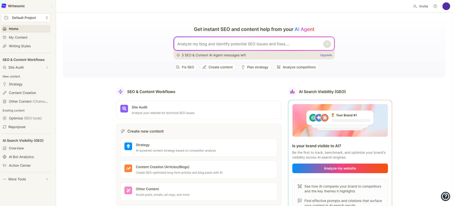 Writesonic также умеет сохранять контекст проекта, например, анализ конкурентов, ключевые промпты, адаптирует рекомендации под нишу и цели.
