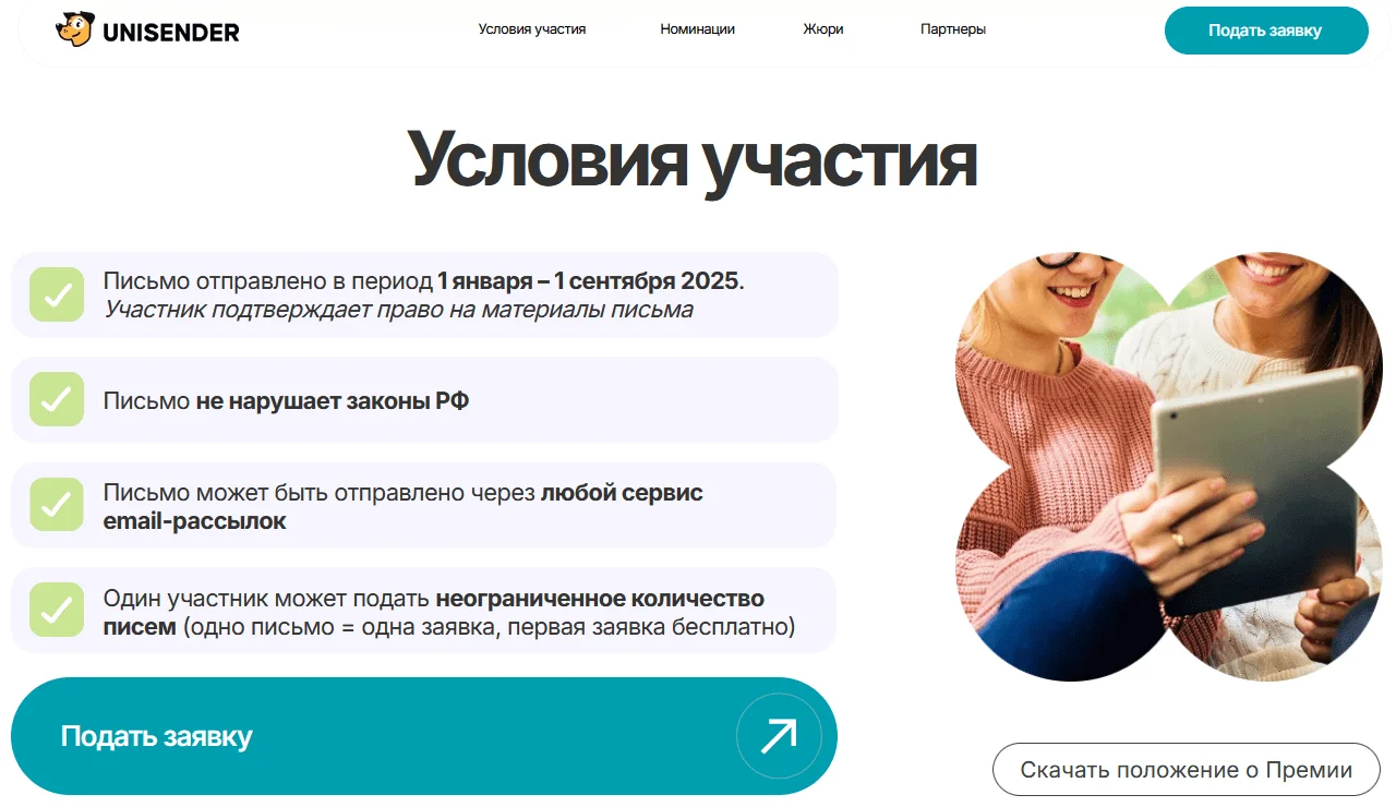 Кто из крупных компаний выигрывал. Т.к. премия новая, победителей пока не было. Вы можете стать одним из них — для участия в Unisender @wards 2025 необходимо подать заявку до 15 октября 2025 года.