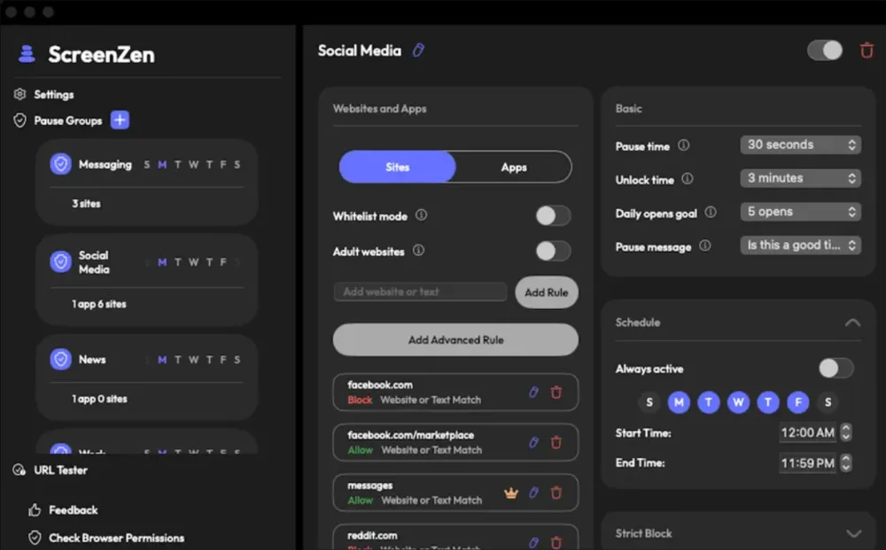 Функционал: блокировка сайтов, фокус-режимы, расписания.