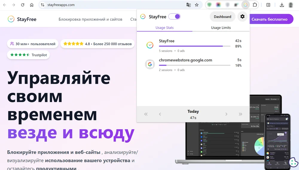 Расширение отлично подходит для работы на ПК, когда необходимо строго контролировать время, проведённое в браузере. Полностью бесплатное, с минималистичным интерфейсом.