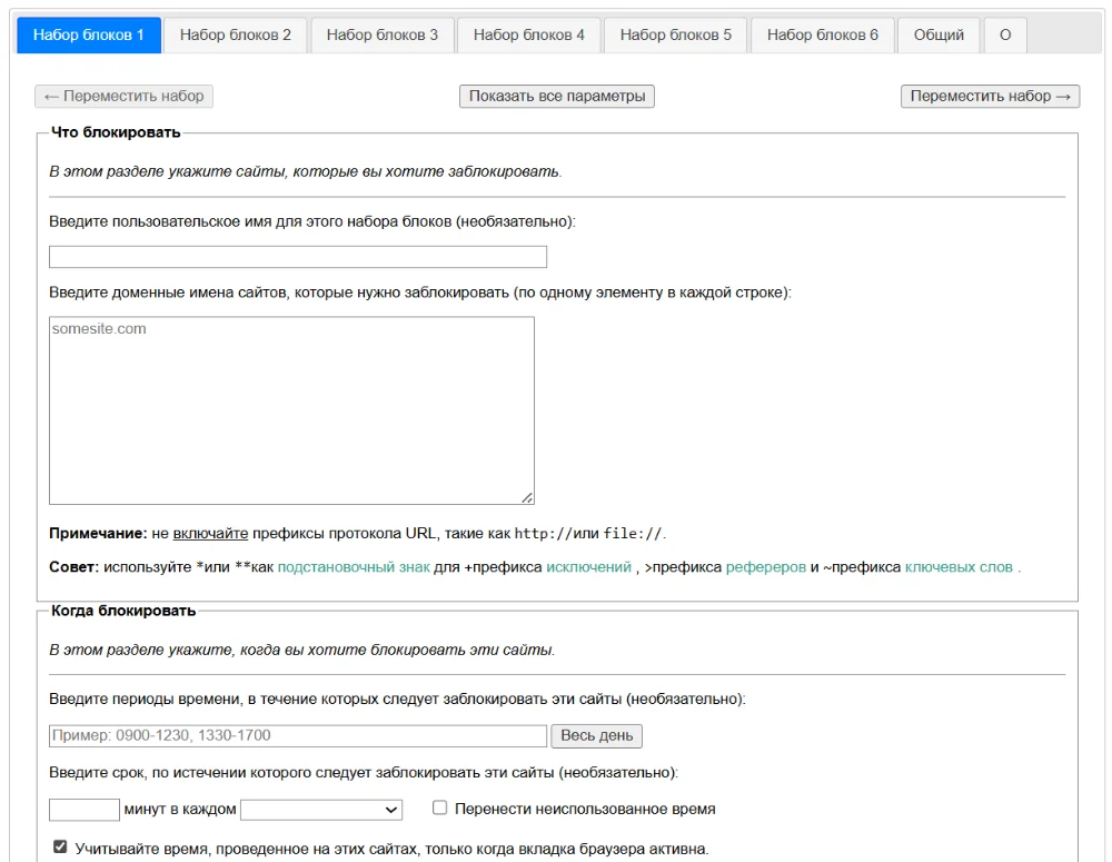 LeechBlock NG — одно из самых гибких и детализированных расширений для браузеров. Оно позволяет блокировать сайтов по времени суток, по дням недели, по количеству посещений или по суммарному времени. Можно создавать несколько независимых списков и настраивать для каждого свои условия.