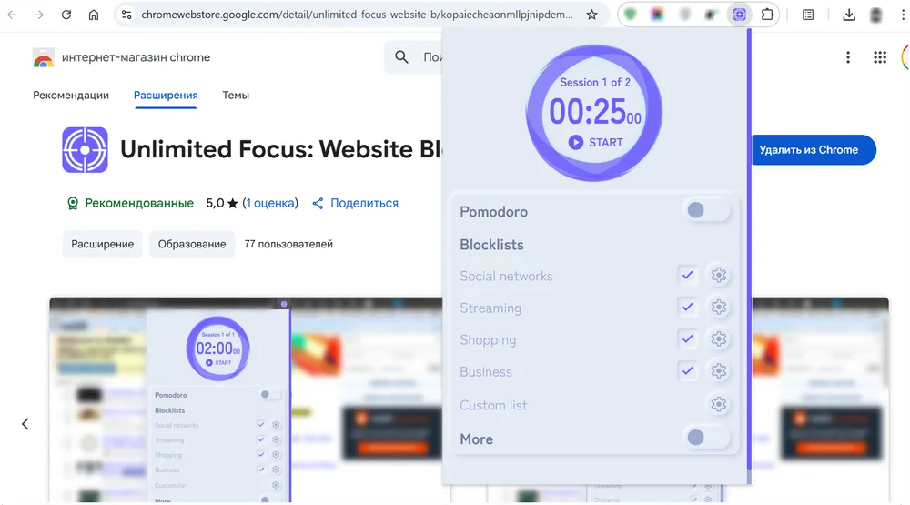 Ссылка: Unlimited Focus: Website Blocker & Pomodoro (Chrome Web Store)