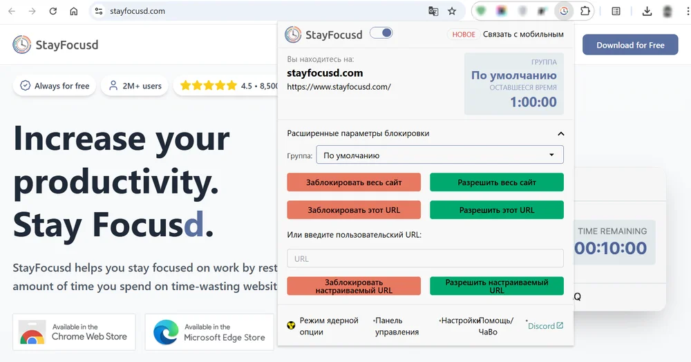 Инструмент полностью бесплатный и идеально подходит для тех, кто работает на компьютере и хочет контролировать именно браузерные отвлечения. Однако он не блокирует мобильные приложения и работает только в пределах браузера.