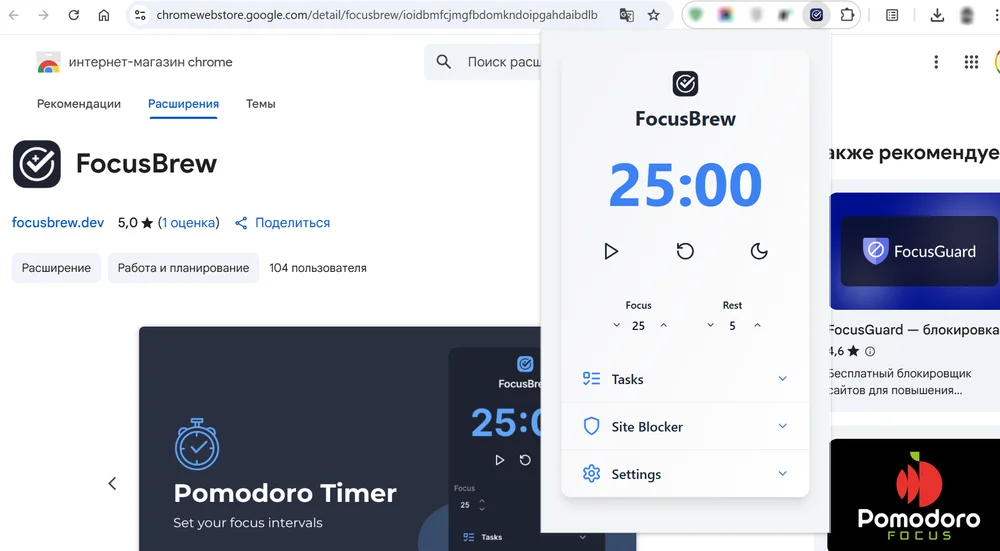 FocusBrew объединяет блокировку сайтов с таймером pomodoro и отслеживанием выполнения задач, что делает его удобным для браузерной работы.