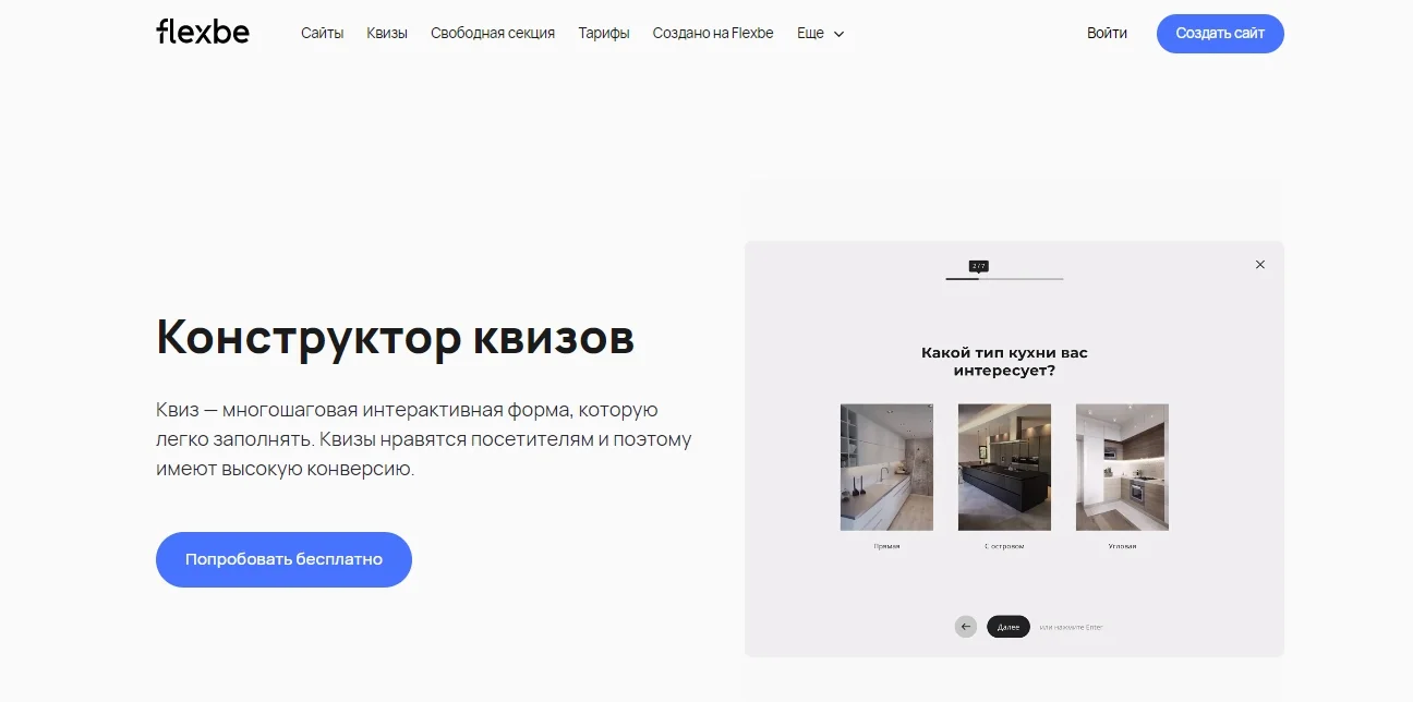 Flexbe — конструктор сайтов, в котором можно создавать несложные квизы с базовым функционалом.