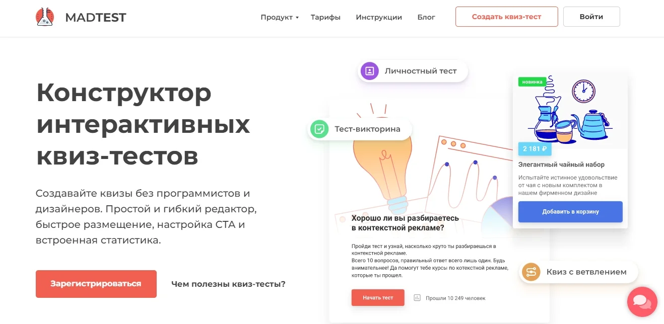 Madtest — конструктор интерактивных квизов в трех форматах: тест-викторина, личностный тест, квиз-опросник.